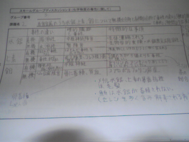 また、実験の他にグループディスカッションが「食中毒」、「化学物質の毒性」についての2回ありました。これは班(9人)で発表者、司会、記録者を二人ずつ最初に決め、司会の二人の内一人はタイムキーパーを決めて、60分間先生から与えられた課題について議論します。タイムキーパーでない方の司会は議論のときに内容が脱線したりしないようにする役割ですが、私の班はたいして機能していなくて、普通に話し合っていました・・・。記録者はホワイトボードが各班にわりあてられるのでそれに表などを書いてまとめていきます。これは、2回あるうち何かしらの役割をしなくてはいけなくて、私は「化学物質の毒性」のときに記録者をやりました。ホワイトボードへは表にして書きました。(写真1)本当は書いたホワイトボードそのまんま写真で撮りたかったのですが、みんながガリガリ書き写しているなか、印象悪いし、態度点が引かれそうなのでレポート冊子に書き写して、ちょっと加筆をいれたものです。見にくくて申し訳ないです。