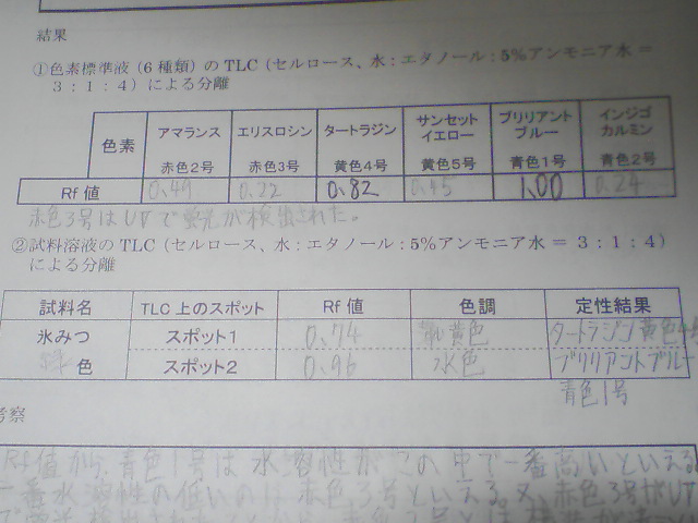 このRf値と展開後のサンプルの着色から同じように氷みつの抽出した色素を用いてTLCでRf値を求めたものと着色を比べて推定していきます。結果はタートラジン(黄色4号)、ブリリアントブルー(青色1号)でした。(写真2)