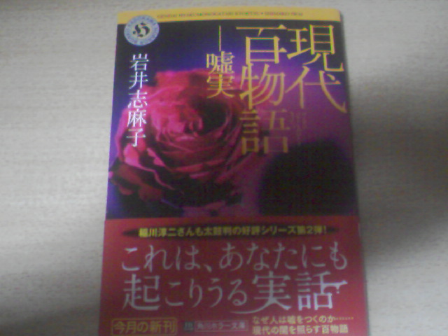 『現代百物語 嘘実』は書いてあることは、岩井先生が実際に聞いた話ですが、この中に出てくる人たちが話していることは本当のような嘘です。逆に本当だったら怖い嘘や架空の人物を作り出しいかにもその人が経験してきたようにさりげなく自分の経歴を語る人など。今は、50話ぐらい読みました、とても面白いです。これ第二弾なんで、第一弾を読んだことないので読んでみたいです。